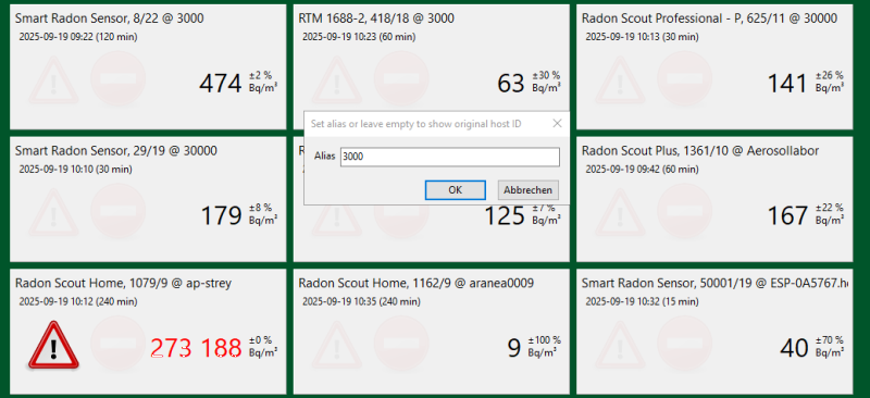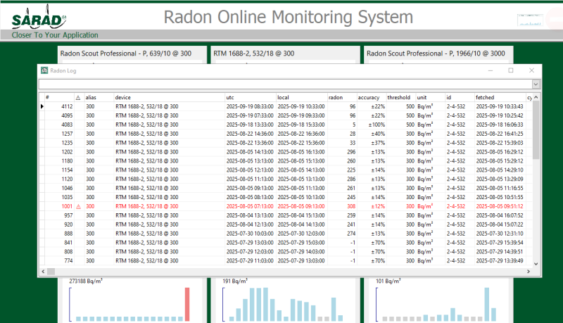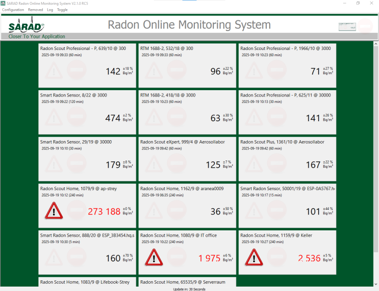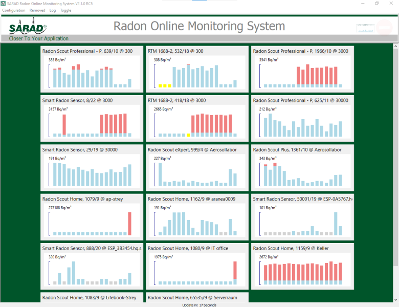 In größeren Gebäuden oder Anlagen besteht oftmals die Notwendigkeit, die Radonkonzentration verschiedener Räume oder Bereiche zentral zu überwachen. Die Einhaltung oder Überschreitung von Grenzwerten soll durch eine Großanzeige für Mitarbeiter oder Arbeitsschutzbeauftragte sichtbar gemacht werden. Mit der Software ROOMS bietet SARAD genau dafür eine einfach zu installierende Lösung auf der Basis vorhandener Netzwerkstrukturen (LAN, WLAN, Internet). Die letzten Meter vom LAN/WLAN Anschluss zum Radon Monitor können dabei auch mit dem SARAD-Drahtlosnetzwerk Net Monitors (ZigBee wireless) überbrückt werden. ROOMS unterstützt alle Geräte der Radon Scout Familie sowie den Thoron Scout und den RTM 1688-2.